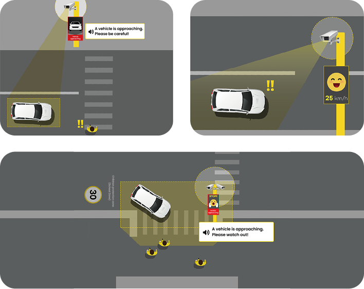 · Provides real-time LED visuals when pedestrians enter roads near crosswalks or school gates